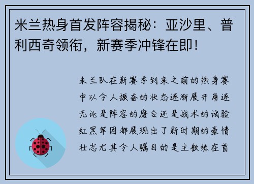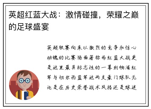 萨勒马科尔斯复出,士气大振——切尔西的新希望 自从上个赛季中期的伤病困扰之后,萨勒马科尔斯的复苏成为切尔西队内外的关注焦点。作为球队的关键翼锋之一,萨勒马科尔斯不仅拥有出色的速度和技术,更是蓝军前线不...