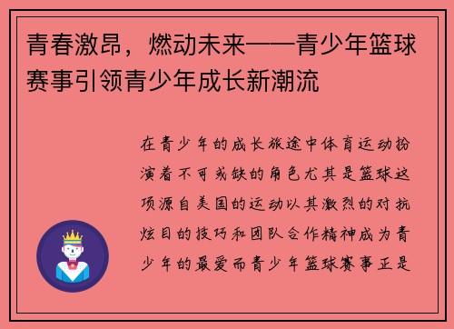 随着中国足球近年来不断寻求突破与提升,越来越多的足球青训机构、俱乐部以及足球爱好者开始关注并推动足球青少年的发展。而在这一背景下,“足球青年联赛”的兴起,不仅为广大青少年提供了展示自己才华的平台,更为...